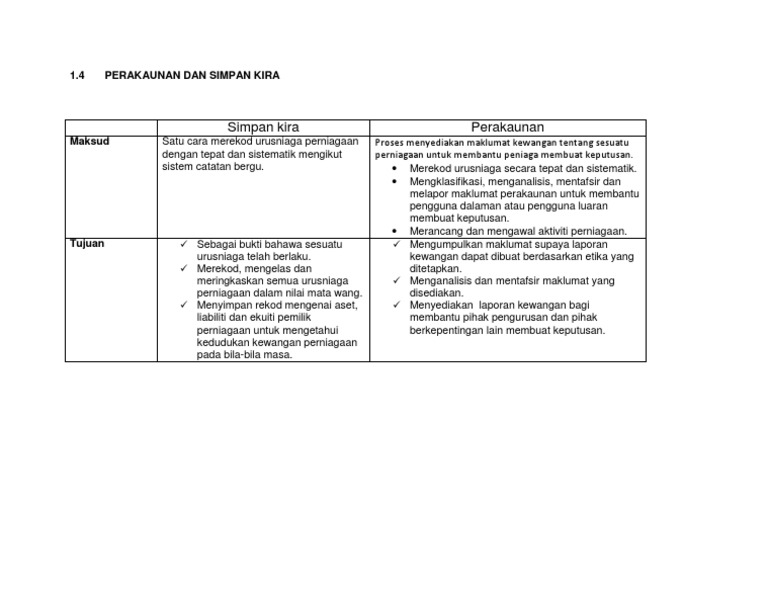 Simpan kira ini dijalankan oleh individu yang mempunyai kemahiran terhad dalam perakaunan. PENGURUSAN KEWANGAN UFM1112 10 PRINSIP ASAS SIMPAN KIRA DAN PERAKUNAN 11 TAKRIF DAN TUJUAN SIMPAN KIRA DAN PERAKAUNAN Ciri-Ciri SIMPAN KIRA PERAKAUNAN Takrif Proses mengenal pasti dan merekod urus niaga perniagaan secara teratur dan tepat mengikut sistem catatan bergu. Simpan kira ting3 nota khb pk tingkatan 3 imbangan duga posted by belajar masak2 at 4 23 2010 09 05 00 pm.