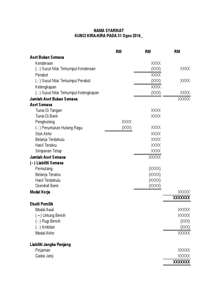24 Full PDFs related to this paper. Kunci Kira-kirapenyataxls - Contoh Format Kunci Kira-kiradalam bentuk penyata Penyata Pendapatan bagi tahun berakhir 31 Disember 2007 RM RM Aset. Walau bagaimanapun syarikat itu juga boleh menggunakan versi penuh dokumen berkenaan mengikut budi bicaranya.